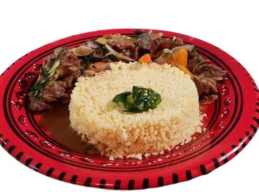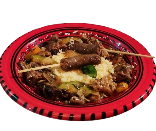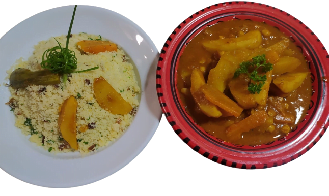 Pomme de terre, oignon, raisin sec, sauce tomate, crème, épices (Avec acc)