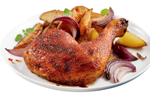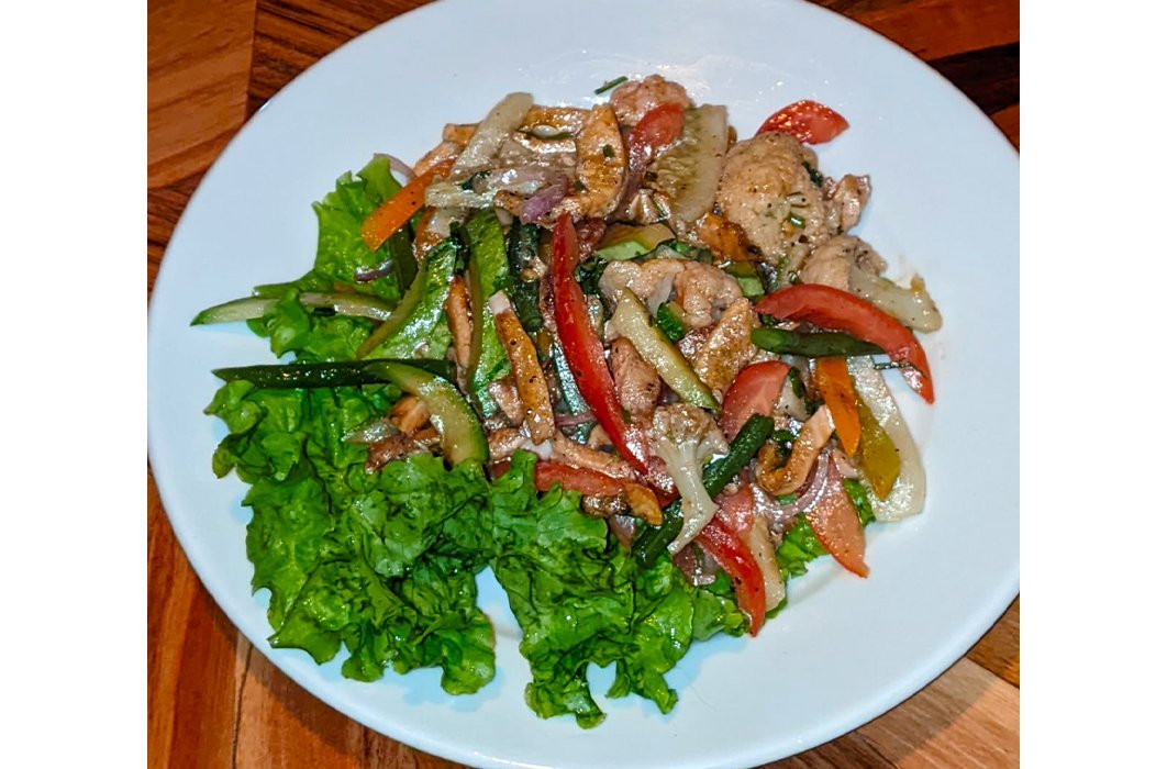 Blanc de poulet mariné grillé, Oignons, Poivrons