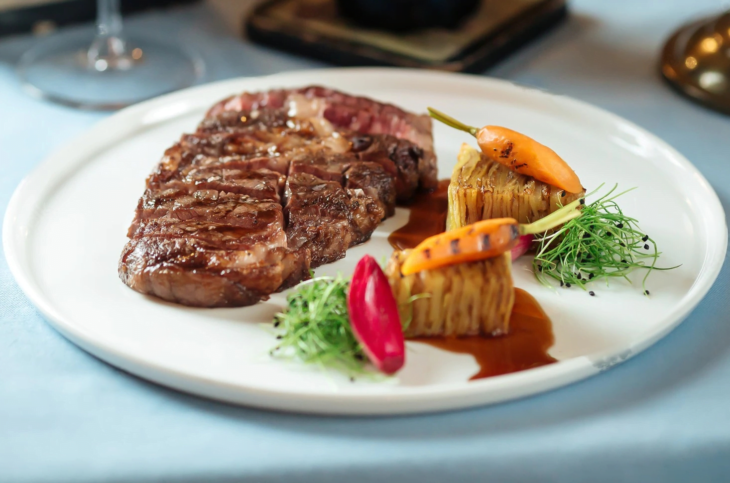 Filet de zébu tendre, surmonté d'un foie gras poêlé, nappé d'une sauce aux huîtres et au vin rouge