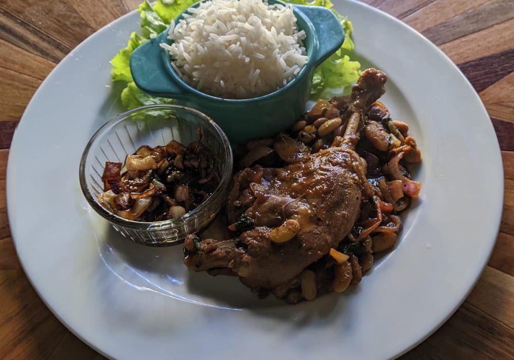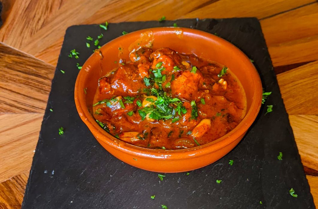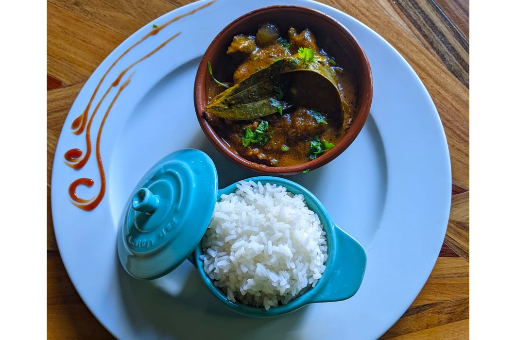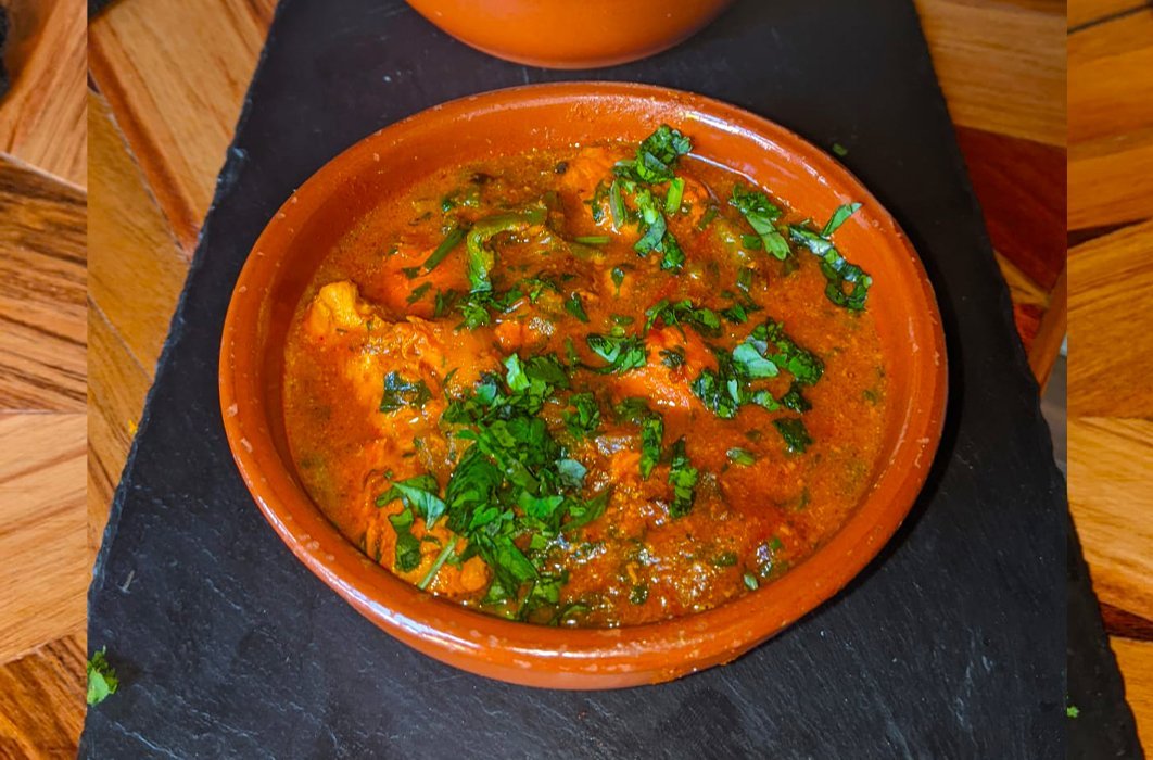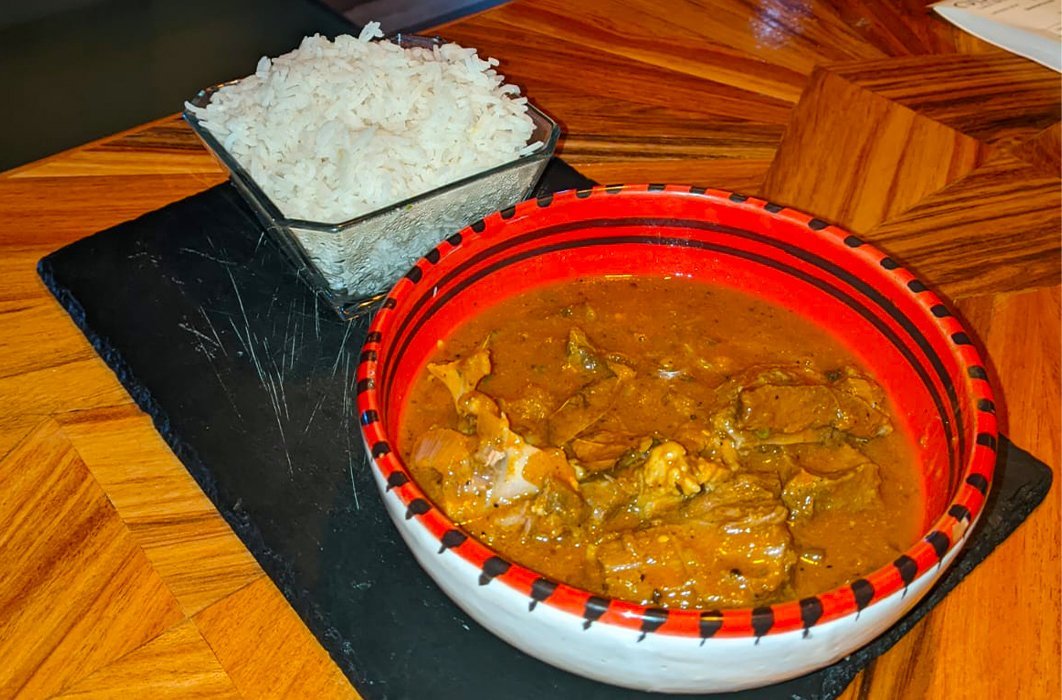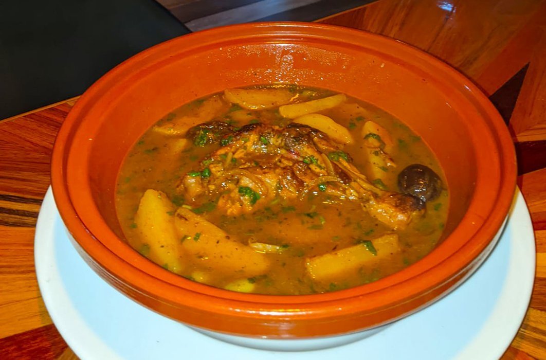 Un plat épicé où des morceaux de poulet, de pommes terre sont mijotés avec des épices