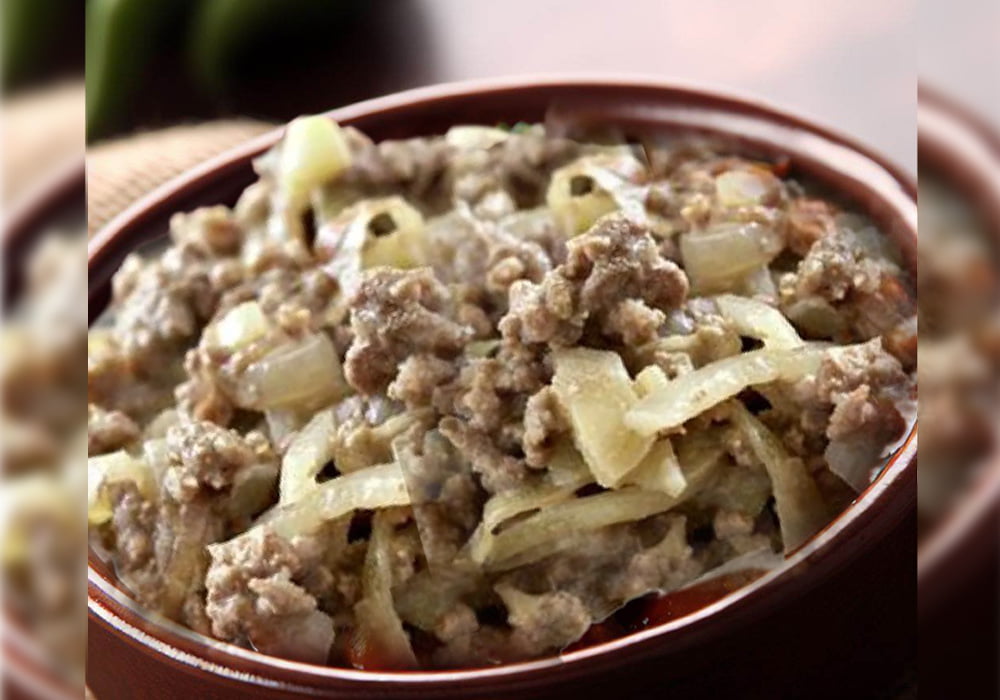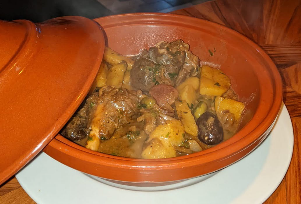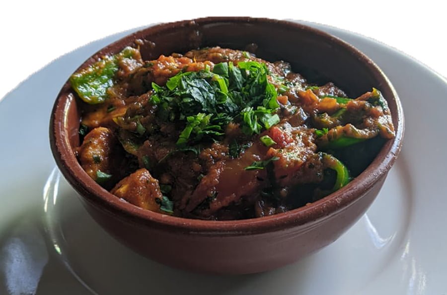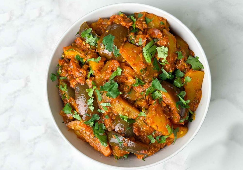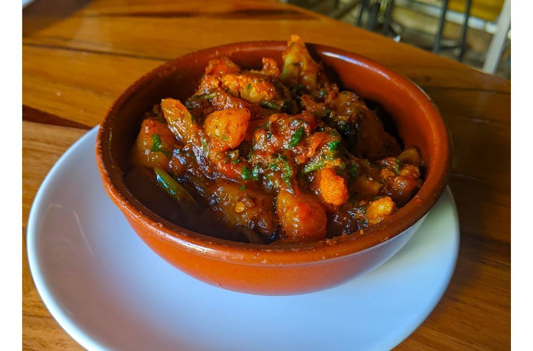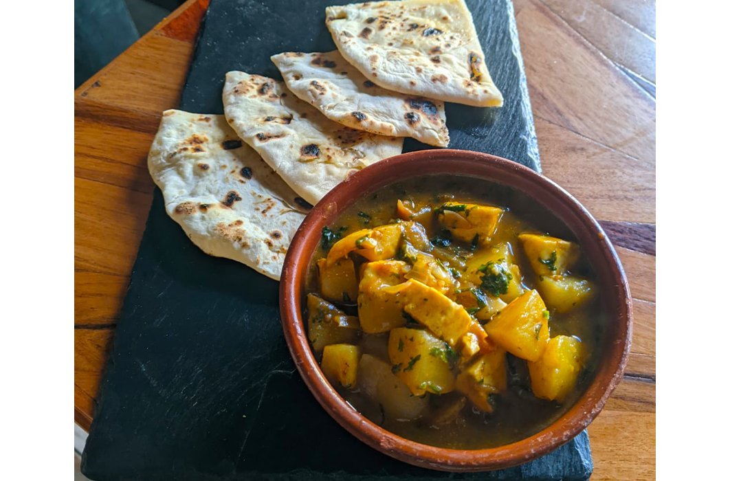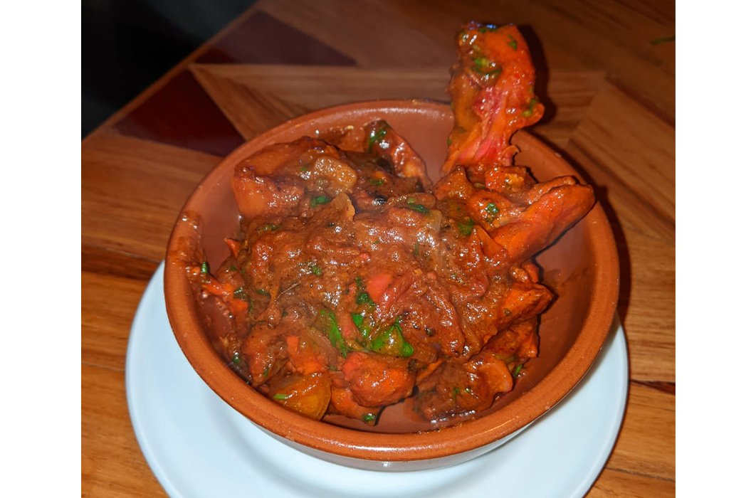 Un plat épicé où des morceaux de poulet, de pommes terre sont mijotés avec des épices