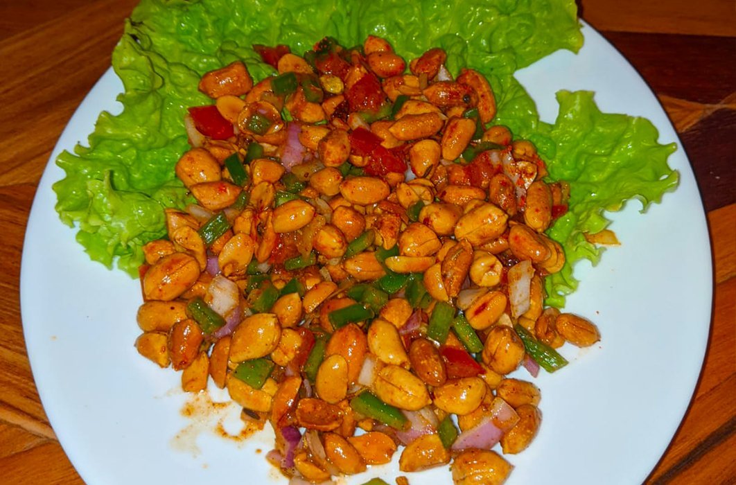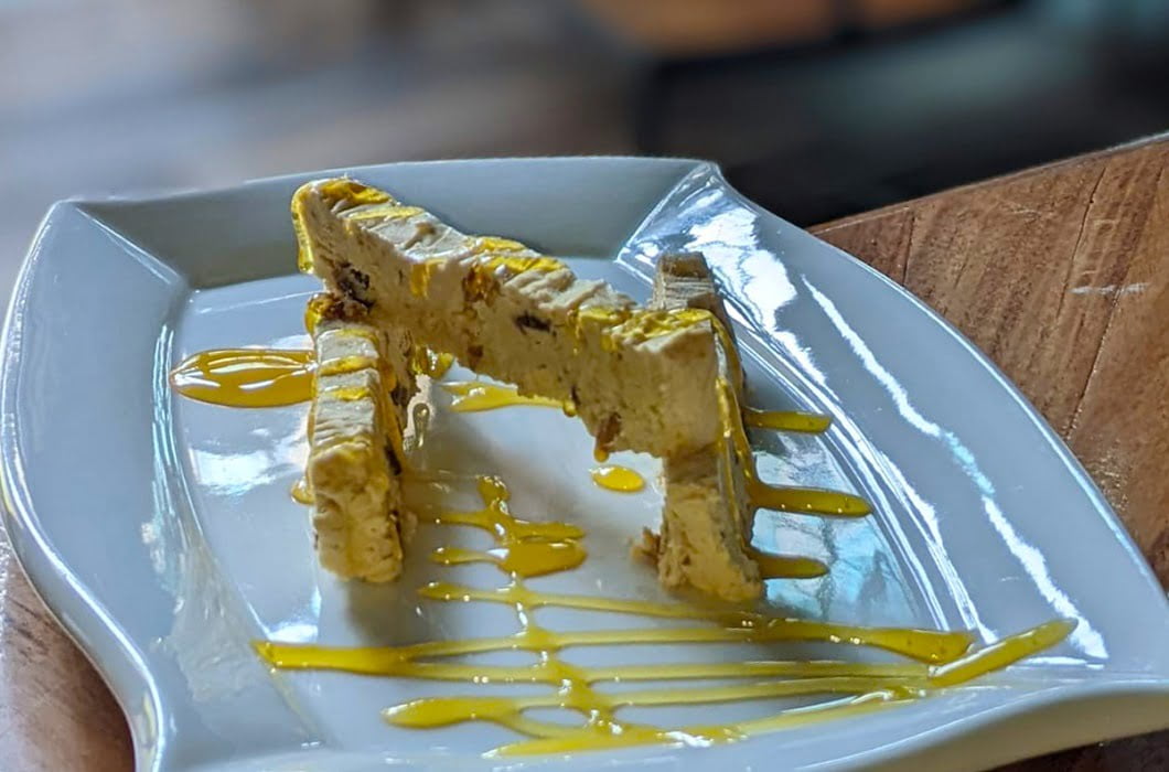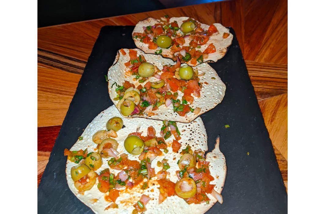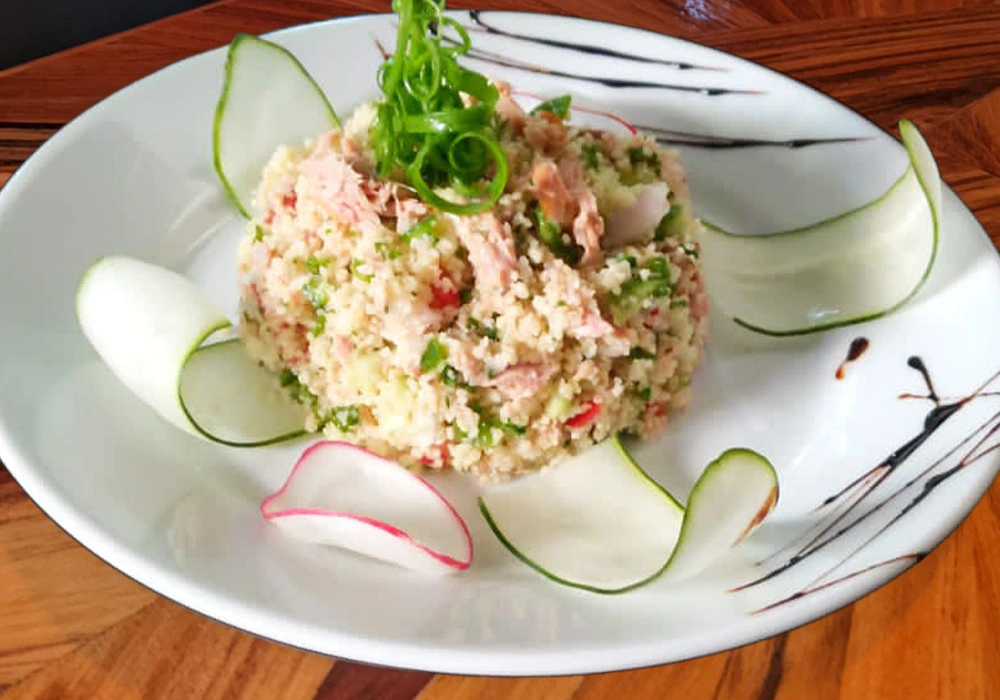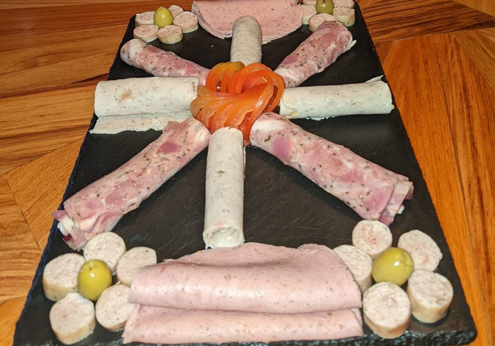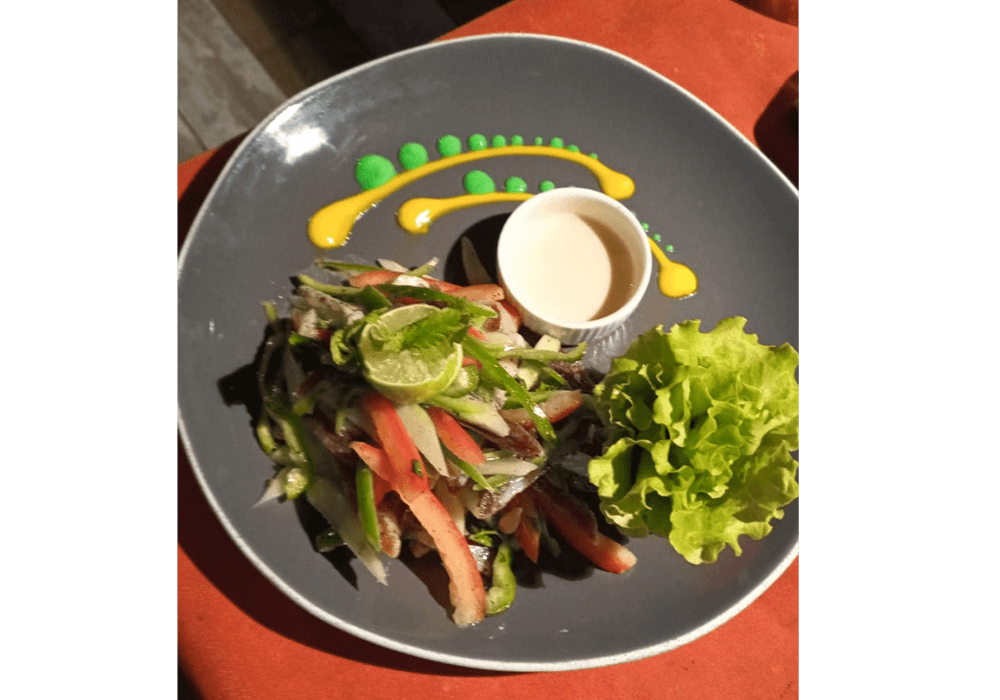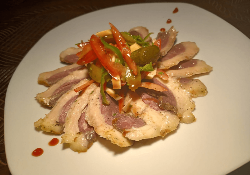 Fines tranches de magret fumé, câpres, noix de cajou croquantes, assaisonnées d'huile d'olive, sel et poivre.