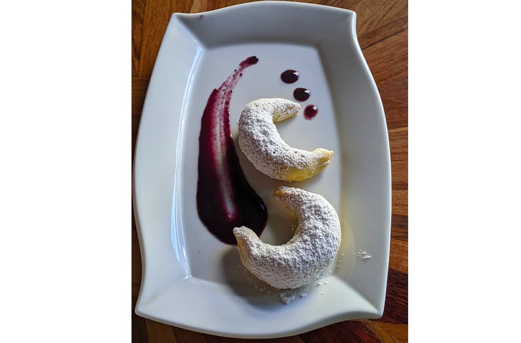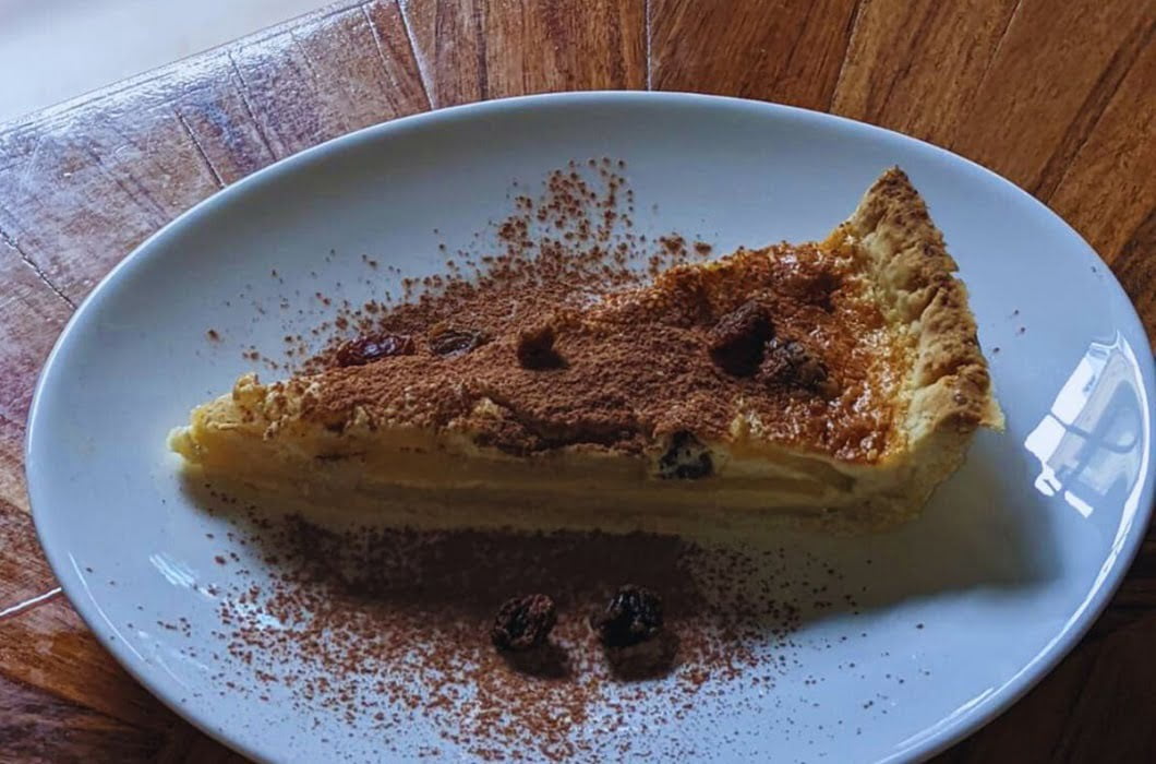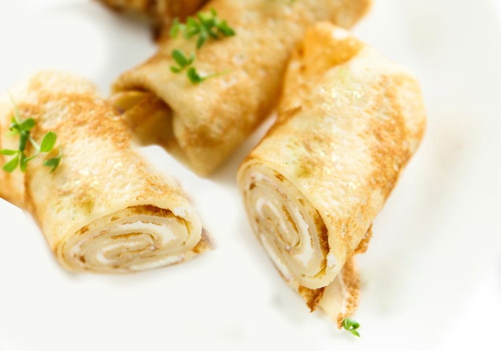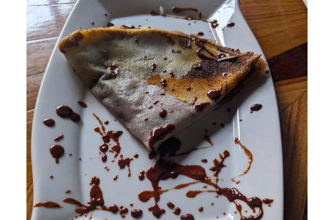 Une crêpe chaude et moelleuse, garnie de morceaux de fruits frais ou chocolat.