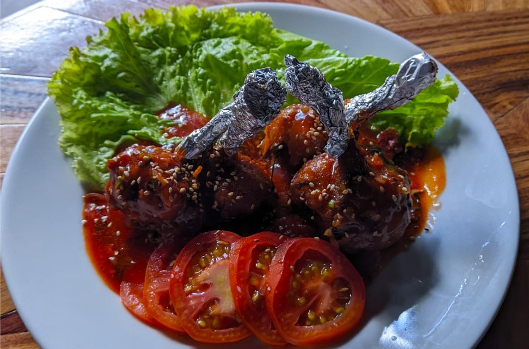 Cinq morceaux de blanc de poulet marinées, frits et servis avec une sauce épicée.