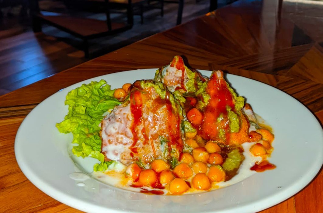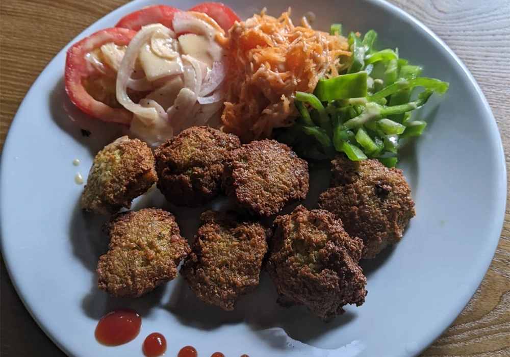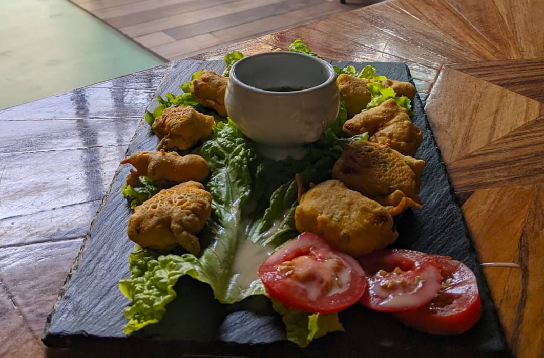 Beignets de légumes indiens épicés et frits à base de pommes de terre, d'épinards et de pois.(Sans acc)