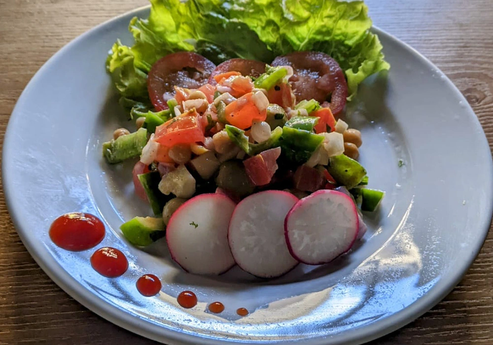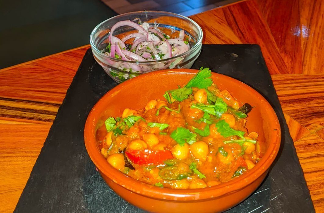 Pois chiches, Pommes de terre, Oignons, Tomates et yaourt, servis avec du pain (Sans acc)