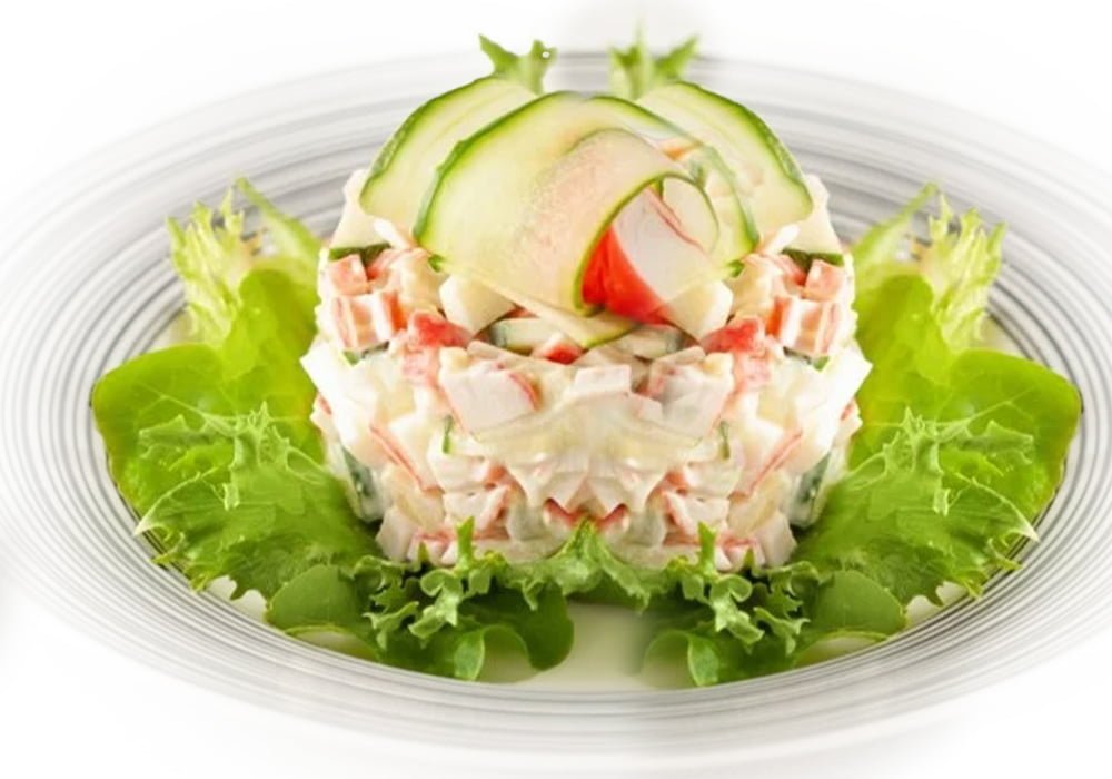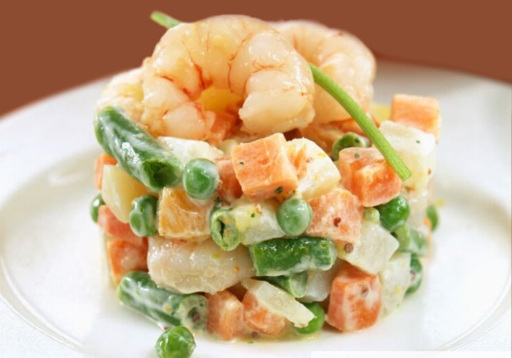 Crevettes, Concombre, Tomate, Oignons, Ananas, avocat, Sauce cocktail.