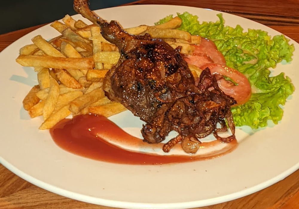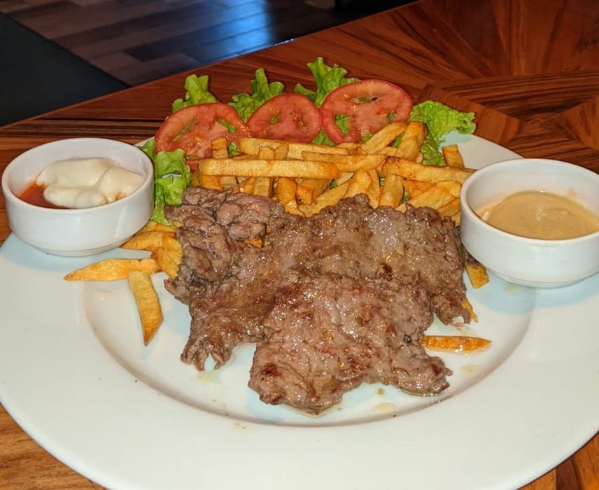 Un steak tendre et juteux, servi avec des frites croustillantes et une salade fraîche