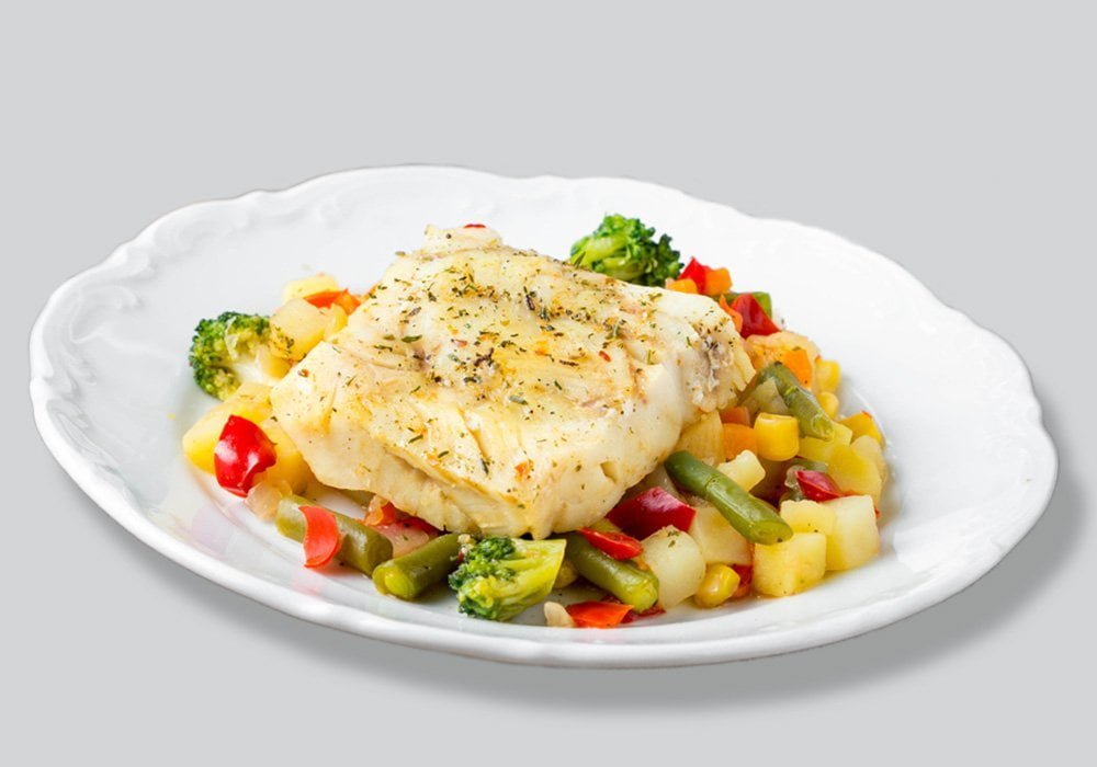 Filets de poisson sont cuits avec une variété de légumes coupés en petits morceaux, carotte, haricot vert, courgette