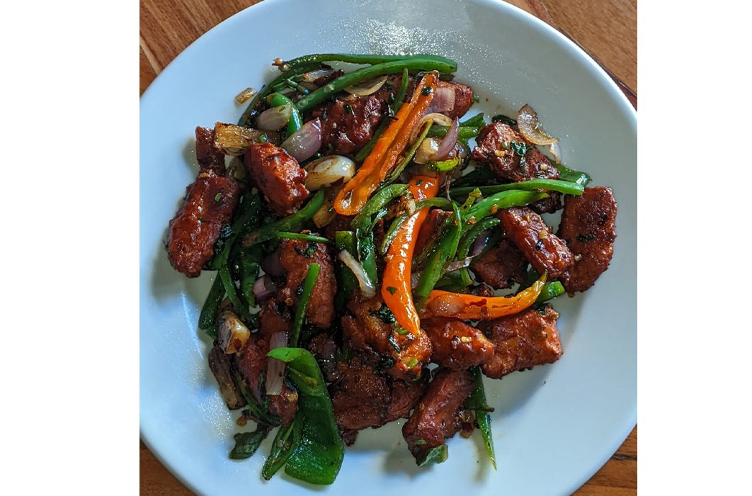 Poulet, haricot vert, carotte, pomme de terre, chou-fleur, sauce aigre-douce, Fine d’herbe