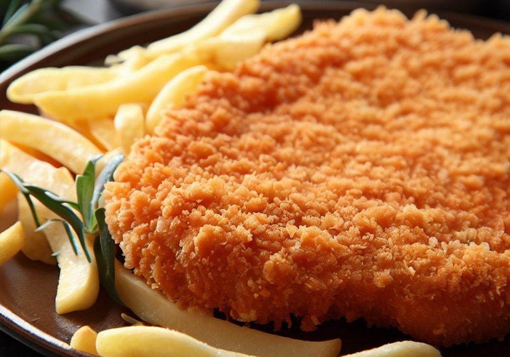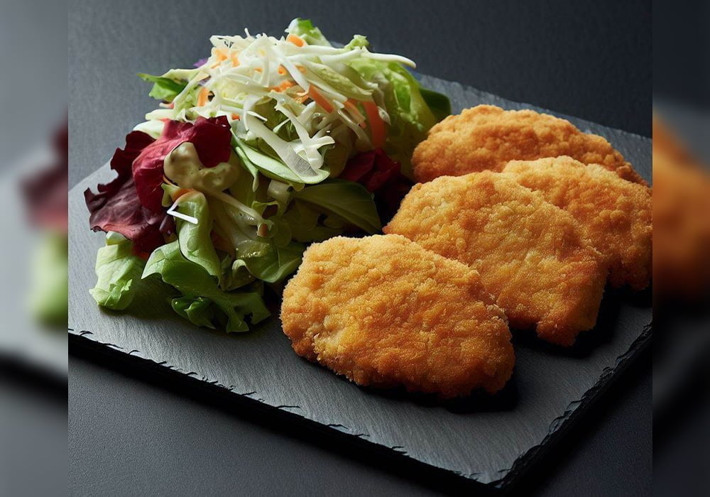 Des escalopes de poulet enrobées d'une panure croustillante à base de cornflakes écrasés.