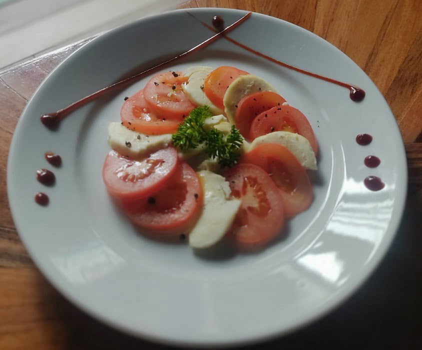 Magret, tomates fraîches, oignons, et vinaigre balsamique, huile d'olive, sel et poivre