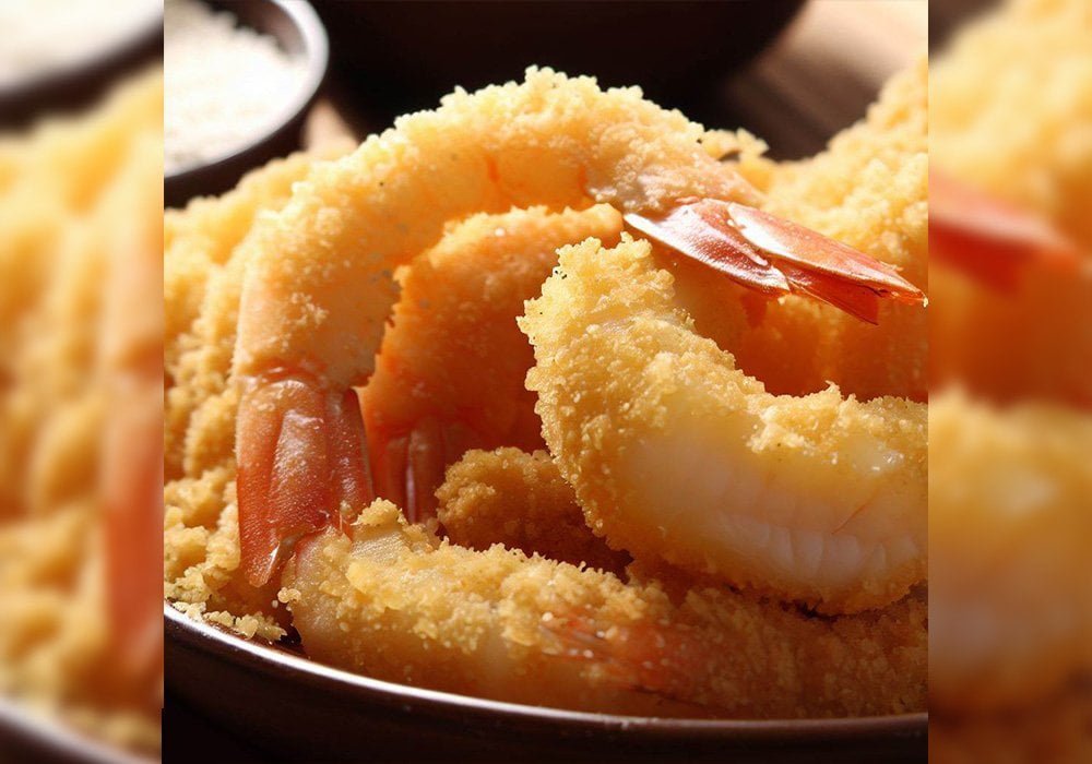 Des crevettes sont enrobées d'une panure croustillante à base de corn flakes écrasés, puis frites