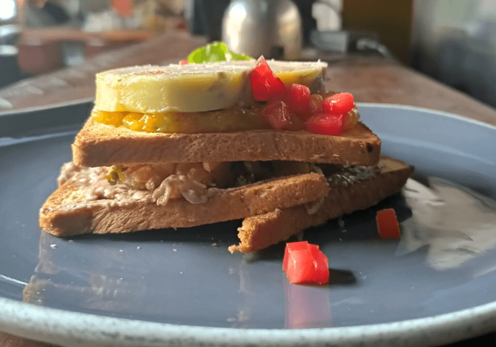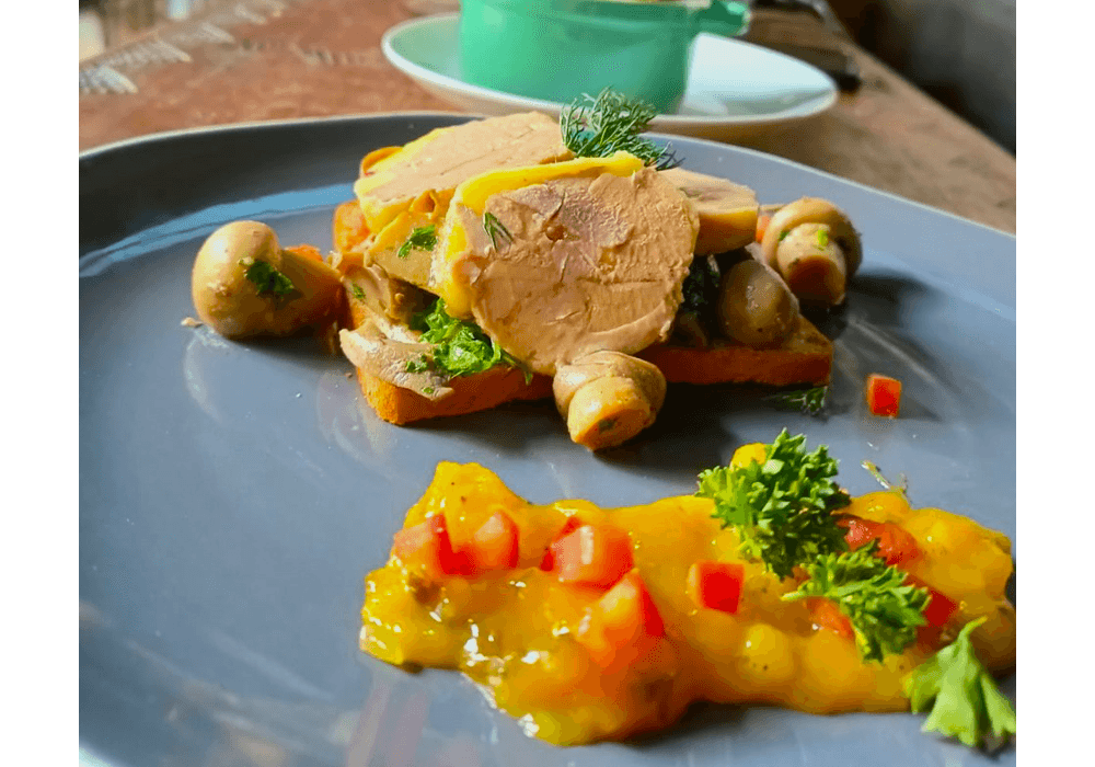 Œuf cuit au four, magret, crème onctueuse, fromage local, coriandre fraîche et oignons, assaisonné de sel et poivre